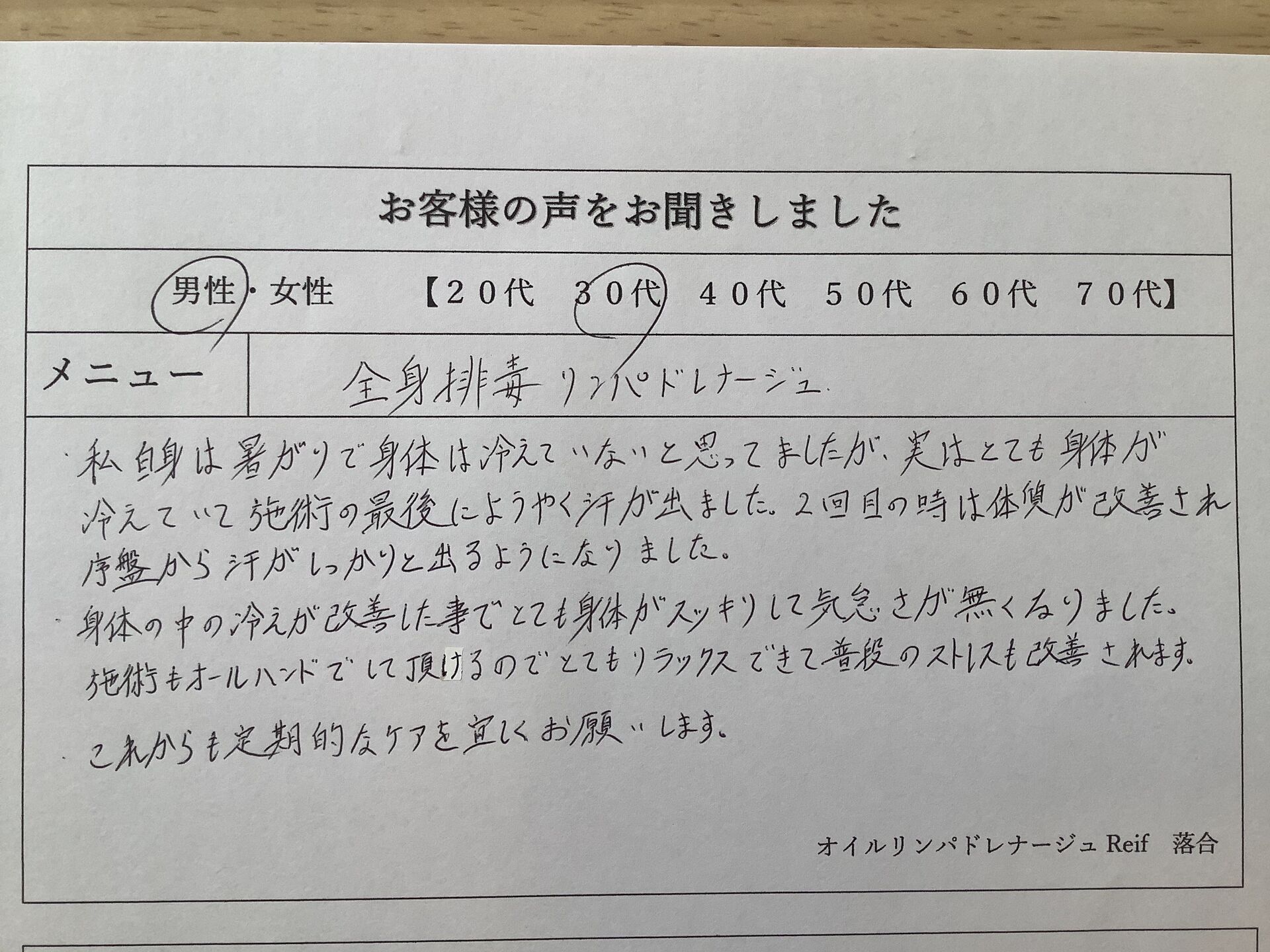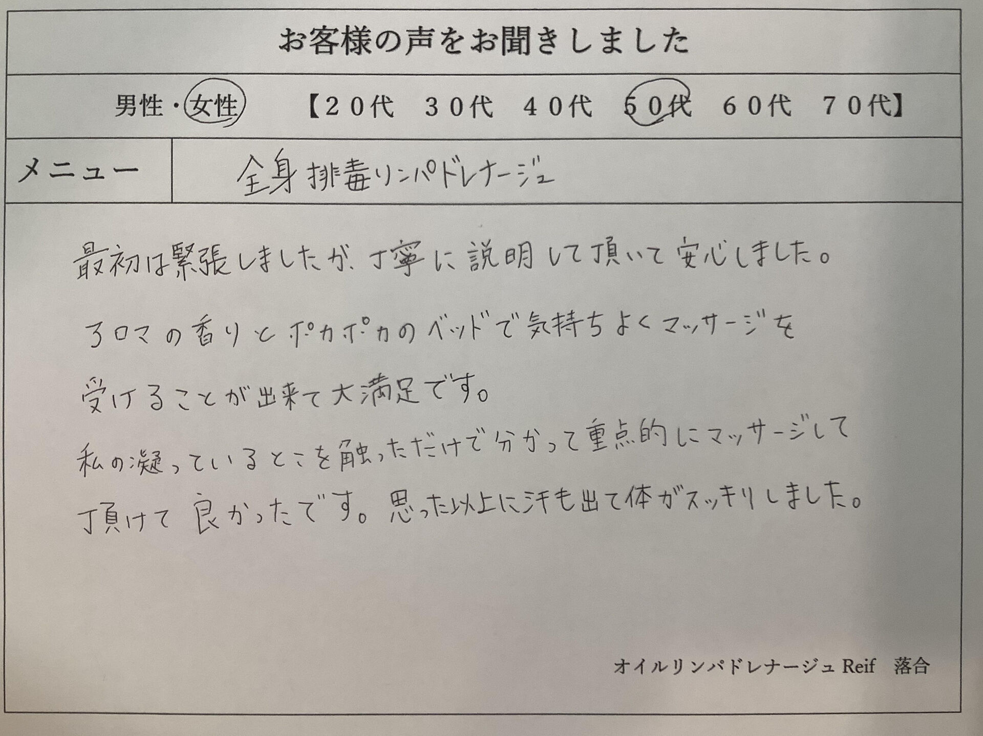 最近なかなか疲れが取れないとお悩みの場合は、ストレスや老廃物が溜まっているかもしれません。そんなお客様に上質なリラクゼーションをお届けしたいという想いで日々営業しており、アットホームでリラックスできるような空間づくりを徹底しています。オールハンド施術で首や肩だけに限らず、全身のもみほぐしを行っており、体をリフレッシュするためのお手伝いをいたします。「丁寧で優しいけど、力強さもある」と嬉しいご感想を頂戴しており、年々リピーターのお客様も増えてきています。